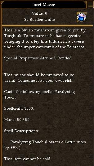 This is a bluish mushroom given to you by Torgluuk. To prepare it, he has suggested bringing it to a ley line hidden in a cavern under the upper catacomb of the Falatacot.