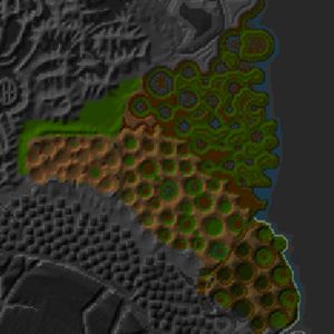 The East Direlands Swamps are dominated by Sclavus, Moarsman, Burun, and Undead. Many Falatacot ruins are located here. The swamps are distinguished from other nearby direlands areas by their lack of Virindi, Shadows, Tumeroks, and Lugians (excluding those that spawn as guardians of chests). The spawn patterns of the swamps extend out of the bounds of the swamps somewhat, as illustrated on the area map.