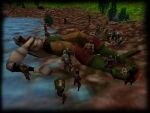 The three-eyed Monouga are highland dwellers who have also taken to living in derelict dungeons. They are aggressive warriors who fight with crude weapons and have a totemistic fascination with fire. Five to six feet tall at adulthood, they continue to grow as they age. Once they reach a certain size, however, their muscles can no longer support their weight. These frail "giants" are cast out into the wild, easy prey for other creatures. Recently, Monouga of tremendous size and strength threatened towns all over Dereth before bands of warriors and sorcerers slew them. It is not known how they grew to such a size while retaining such incredible strength.