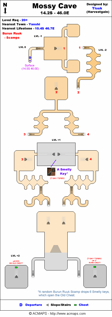 - Enter the Mossy Cave at 14.1S, 46.0E near Yanshi. Kill Burun Ruuk Scamps for A Smelly Key. Note that the scamp that drops the keys can be found at the midpoint of the dungeon. As you proceed through the dungeon, when you hit the third square room, go up a ramp in the opposite direction from the ramp you entered the room from. You will be in a rectangular room with two exits. Once you have the key, proceed back down the ramp to the square room and out the same-level hallway toward the the end of the dungeon to retrieve the Necklace of Leerargh from An Old Chest.