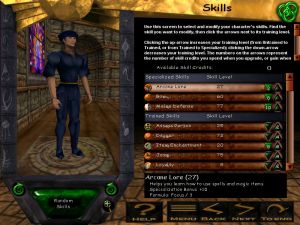 If you had chosen custom character on the previous page, you can now purchase your starting skills. You have 50 Skill Credits to work with. Whatever you do not spend now will be added to your Skill Credit pool upon entering the game. You can only initially specialize skills during character creation, though you can specialize more later. You can read more about skills here.
