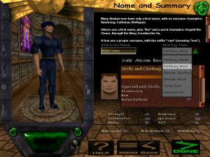 This page gives you a summary of the choices you have made so far. It is at this stage that you give your character a name. You can name your characters whatever you wish, assuming the name is not already taken and that it is allowed by the naming filter. Please be aware of the Code of Conduct and the Teen rating of Asheron's Call when creating your character. Characters with offensive names may be deleted or renamed by admins. If you want to go with a name more fitting to the Asheron's Call universe, see Character Creation - Naming.