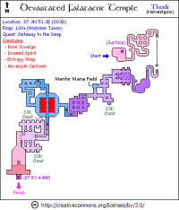 1. The large room (on the map with the red square). Also, after going up the ramp and reentering the room from the North, it appears as if there is no floor, but it is invisible. Additionally, monsters can fall into the pit and get stuck.