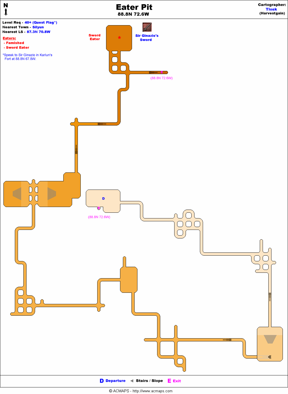 - Use the exit portal and run due west to the Eater Pit at 88.8N 72.6W. At the end of the dungeon is an Eater named Sword Swallower. Kill him and loot Sir Ginazio's Sword. Each person in the party will need a sword, one per spawn.