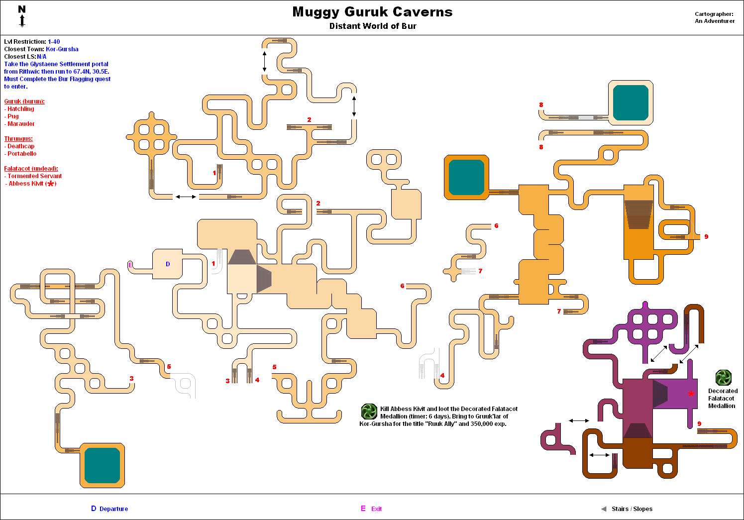 | Route | Rithwic to Glystaene Cottages settlement portal (8.8N 60.9E). Run uphill from 64.1N 29.6E and enter Bur (be flagged) at 67.4N 30.5E >> Run down through the dungeon to the Kor-Gursha portal. The portal to the dungeon is down the southeast corridor from the room with all kill task NPCs. |