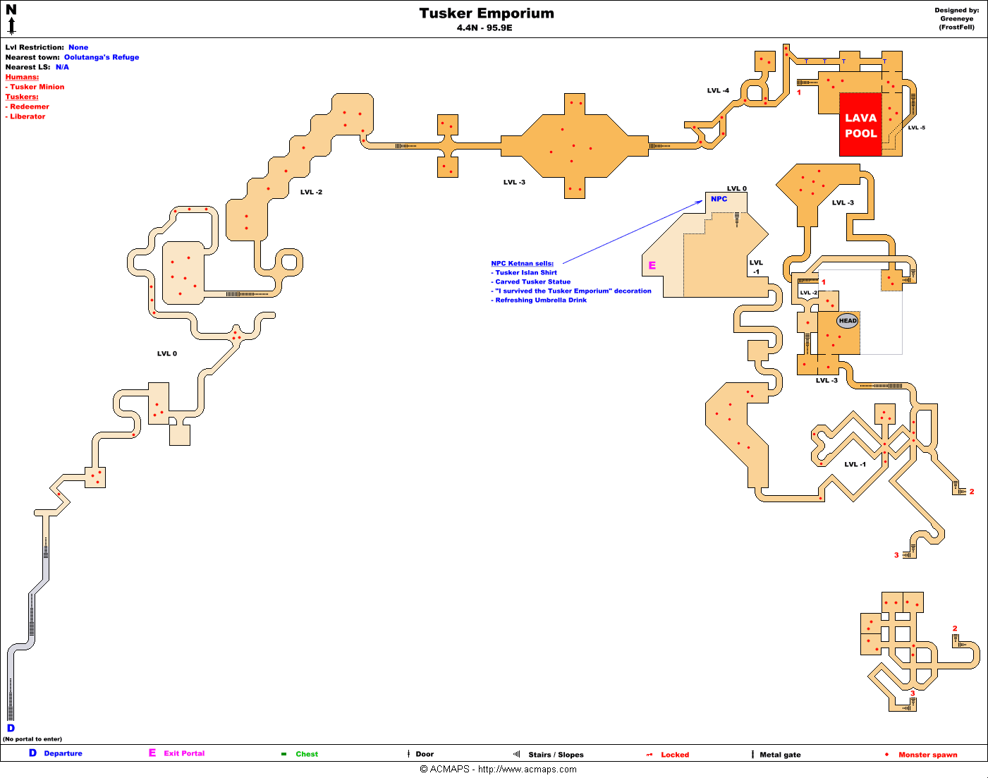 | Tusker Temple | 10.5S, 65.6E, near Dryreach | Oolutanga's Refuge | 2.3N, 95.4E | 1-20 |