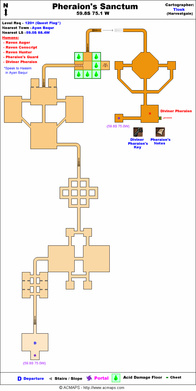 - Head north through the dungeon avoiding detours through the side passages. You should come to a room with an acid pit and a statue of Bael'Zharon. Jump down and take the north ramp heading south to Pheraion's room.