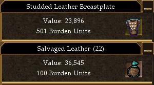 The value of the salvage that results depends on salvaging skill and is affected by salvaging augmentations (workmanship has no effect). At low skill levels the resultant salvage retains only a portion of the original item's value, however at higher skill levels the value returned is greater than the original's and is in effect a bonus. In other words, selling a salvage bag gives more pyreals than if you were to sell the item as is. This is a very effective way of earning pyreals because it allows you to condense items in the field into high value bags to sell later (keep in mind the 400,000p value limit though). This means that you can earn nearly 150% of the face value of items you sell. To further maximize your earnings sell your bags to vendors that buy at or near face value, for example Tunlok Weapons Master for 100% (Town Founder quest required for access) or Janier al-Evv for 95% (no quest required).