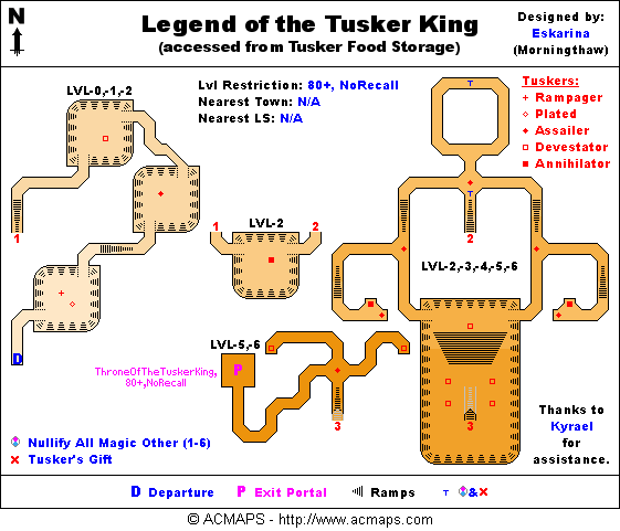 - From the drop, just follow the linear path through some small rooms containing crude Tusker paintings until you come to a split. Take either direction and head south to a large ramped room, take the ramp down and go west at the junction to the Throne of the Tusker King portal.