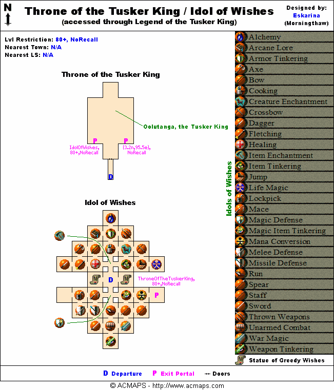 - Inside this dungeon are a series of tusker statues, each one corresponds to a skill and most give experience into that skill (random) or alternatively give a special reward about 3% of the time. The main exception is the Statue of Artificer's Wish which always gives the spell Recall Aphus Lassel. See the table below for a complete list of possible rewards.